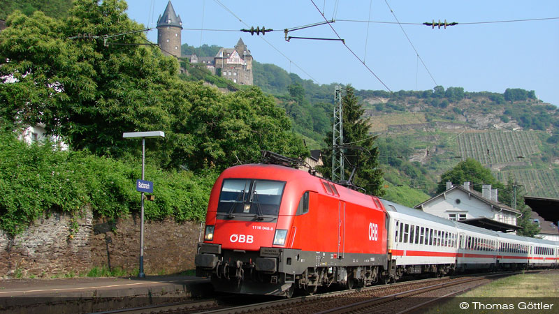 Dieselbe Leihlok, die 1116 048-8 vor dem EC 6 auf der linken Rheinstrecke und durchfährt soeben den bekannten Ort Boppard. 13. Juni 2006 | ||