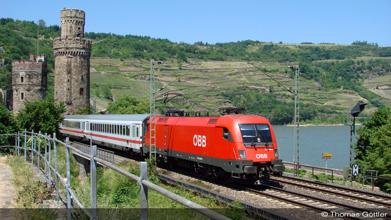 Hier ist einer der WM2006-Helfer für die Deutsche Bahn vor einem InterCity auf der linken Rheinstrecke unterwegs und passiert den Bahnhof von Bacharach – die 1116 048-8 der ÖBB. 17. Juni 2006 | ||