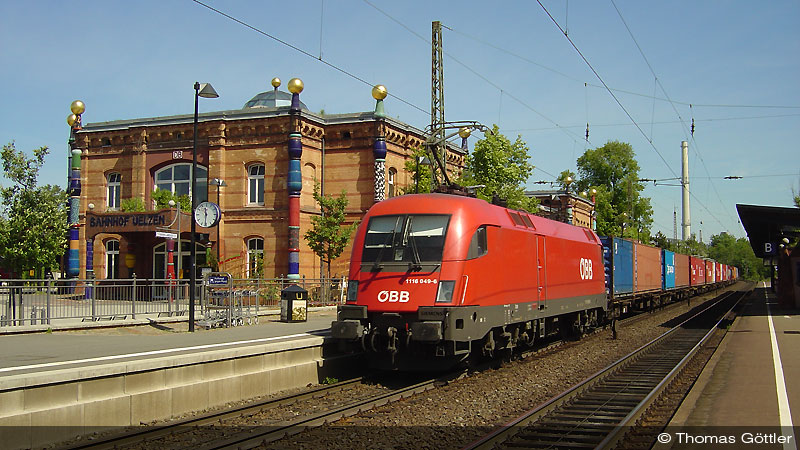 Den bekannten "Hundertwasser-Bahnhof" von Uelzen an der Hamburg-Hannoveraner Strecke passiert die 1116 049-6 mit einem langen Containerzug aus Hamburg. 26. Mai 2005 | ||