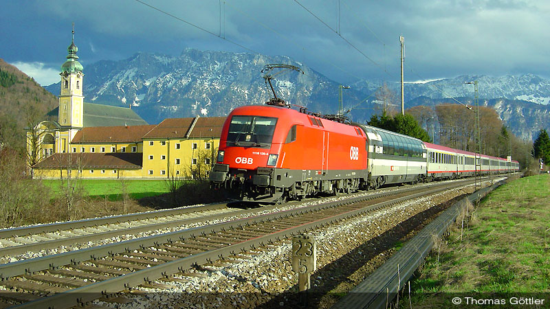 Vor der grandiosen Alpenkulisse ist die 1116 130-4 mit einem EC, der aus österreichischen Wagen und einem SBB-Panoramawagen besteht, unterwegs und passiert die Kirche von Oberaudorf. 16. April 2006 | ||