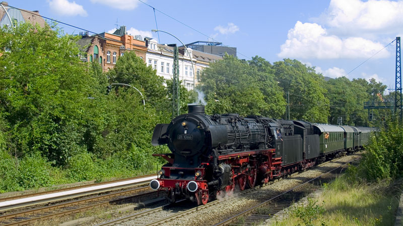 Ulmer 01 1066 mit ihrem Sonderzug von Köln nach Hamburg auf der Hamburger