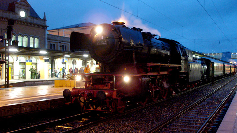 Volldampf fährt der oben genannte Pendelzug mit der 23 042 und der