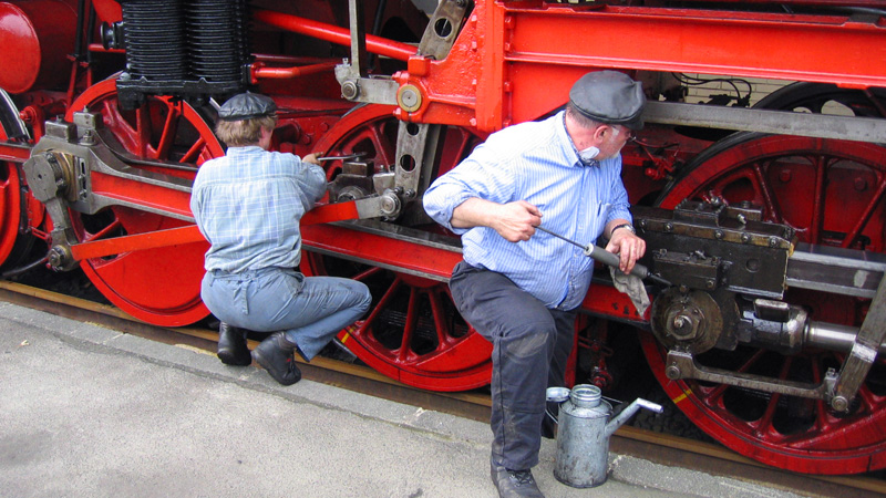 Eisenbahn Frankfurt beim Wasserfassen frisch geölt. 30. April 2005 |