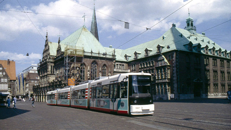 Linie 3 nach Weserwehr das Bremer Rathaus – links steht der Roland.