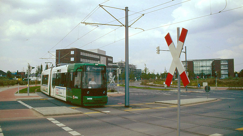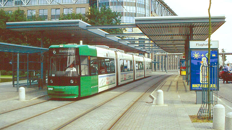der Neubaustrecke der Linie 6 zum Flughafen eilt der GT8N No. 3040 mit grüner