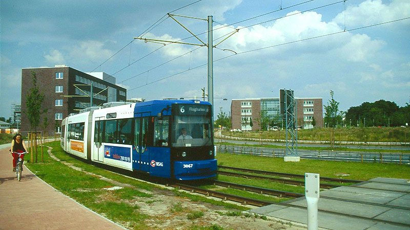 der neuen Flughafenstrecke überholt dieser GT8N 3067 locker eine Radfahrerin