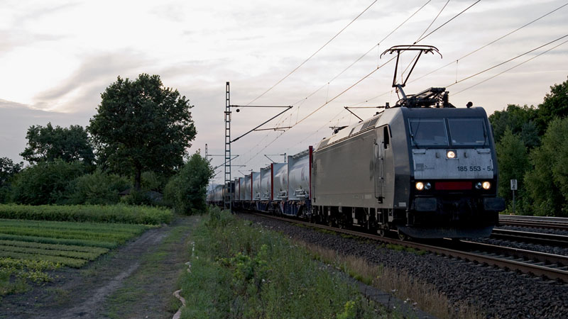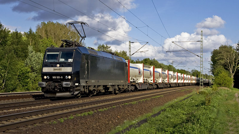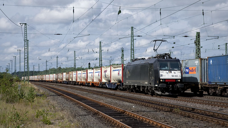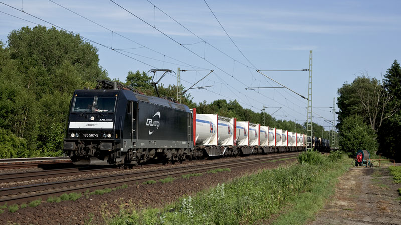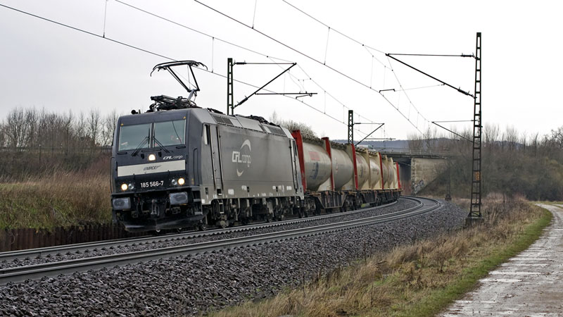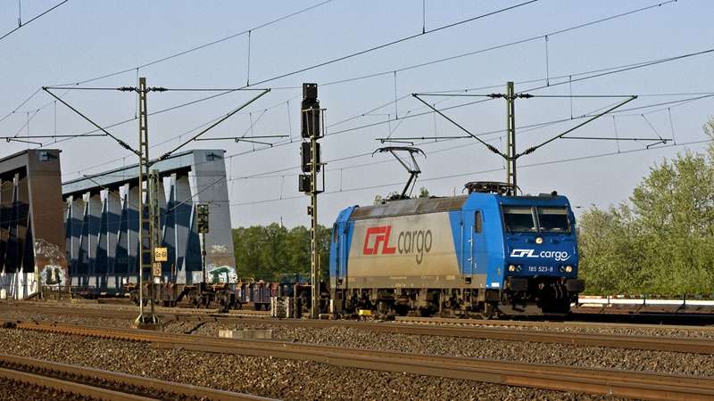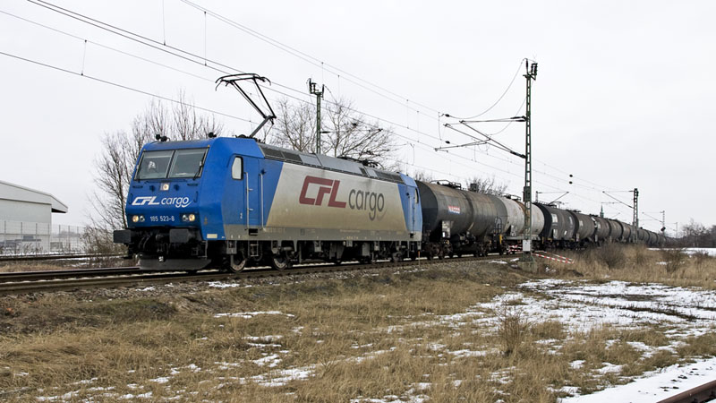 185 523-8 der CFL Cargo mit dem Dyckerhoff-Tankcontainerzug.