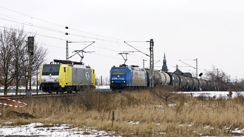 Die ES 64 F4-203 der ITL mußte am Einfahrsignal warten und den Kesselwagenzug vorbei lassen.