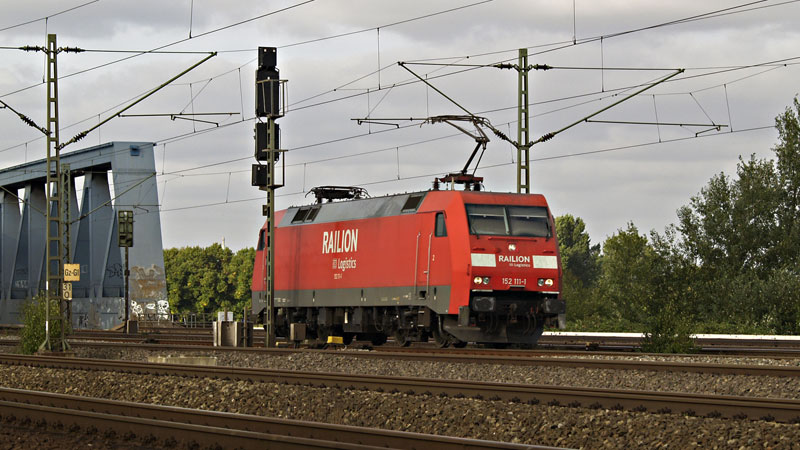 | Der Containerzug mit der 152 101-2 ist eine Weile vor der Kattwyk-Hubbrücke hängengeblieben und nun fährt sie an um gleich über die Hubbrücke nach Hamburg Hausbruch zu poltern. 7. November 2006 | ||