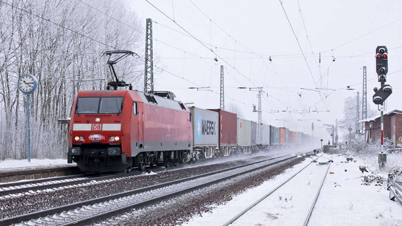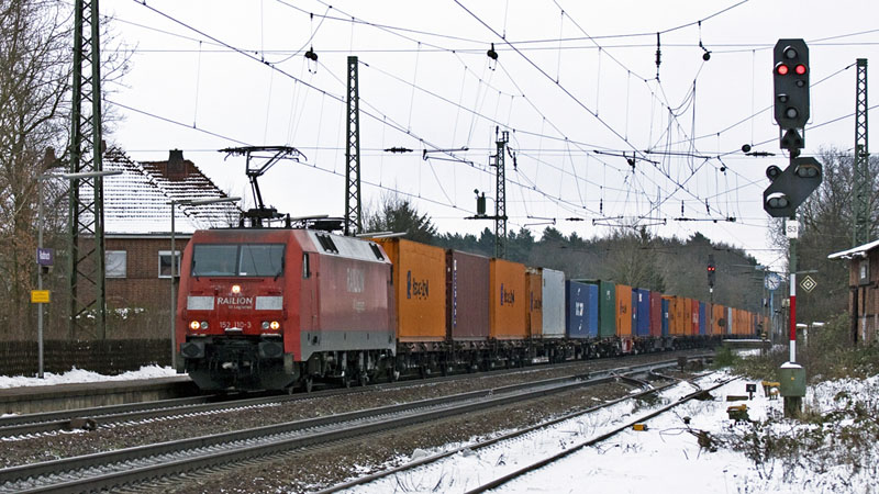 | Diesen Containerzug nach Hamburg hatte die 152 130-1 am Haken. Radbruch, 17. Dezember 2010 |