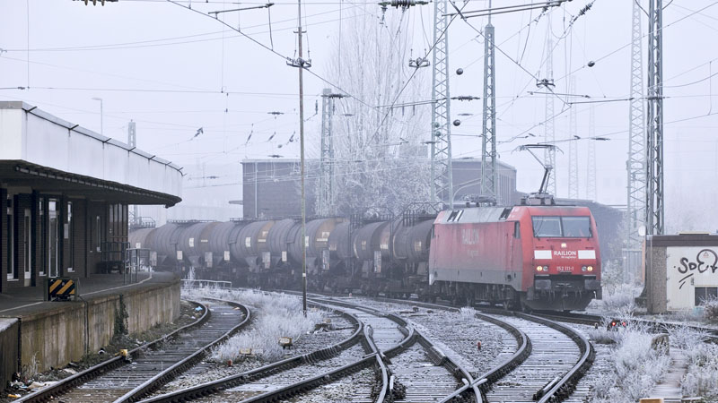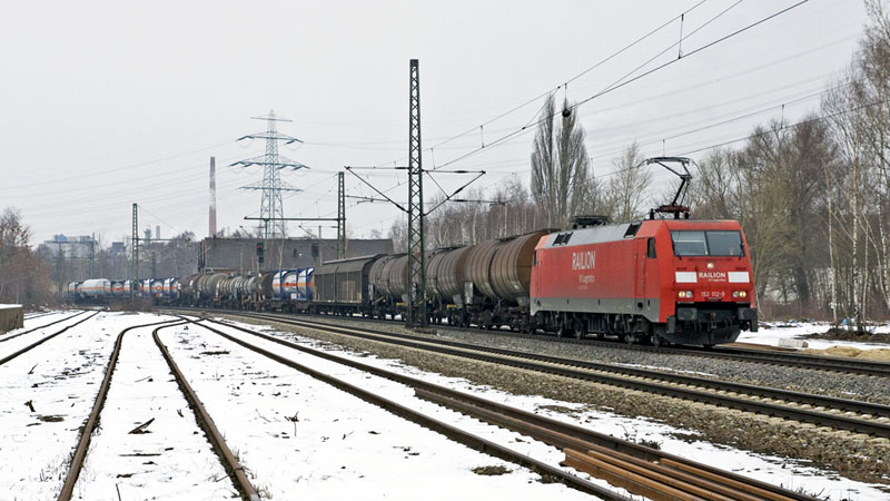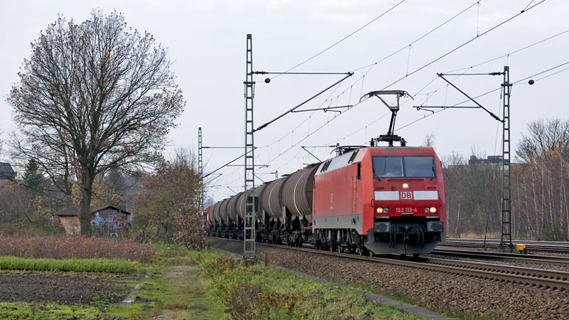 | Einen schweren Petrochemiezug brachte die 152 119-4 von Maschen nach Itzehoe. Halstenbek, 16. November 2010 |