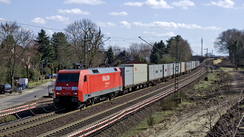 | Einen langen Containerzug aus dem Süden hatte die 152 117-8 in den Hafen zu ziehen. Stelle, 2. April 2010 |