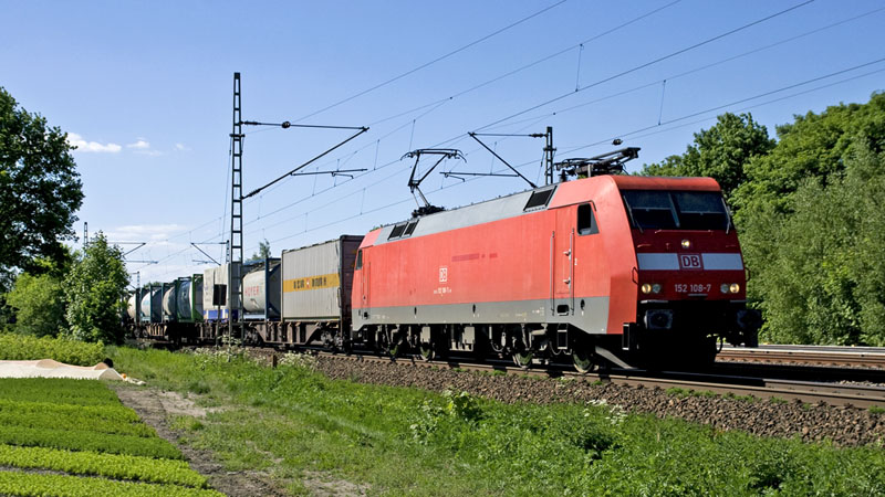 einem Autoteile-Ganzzug ist die 152 124-4 – mit Mini-DB-Keks verziert