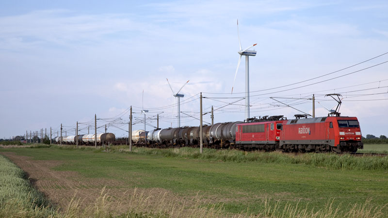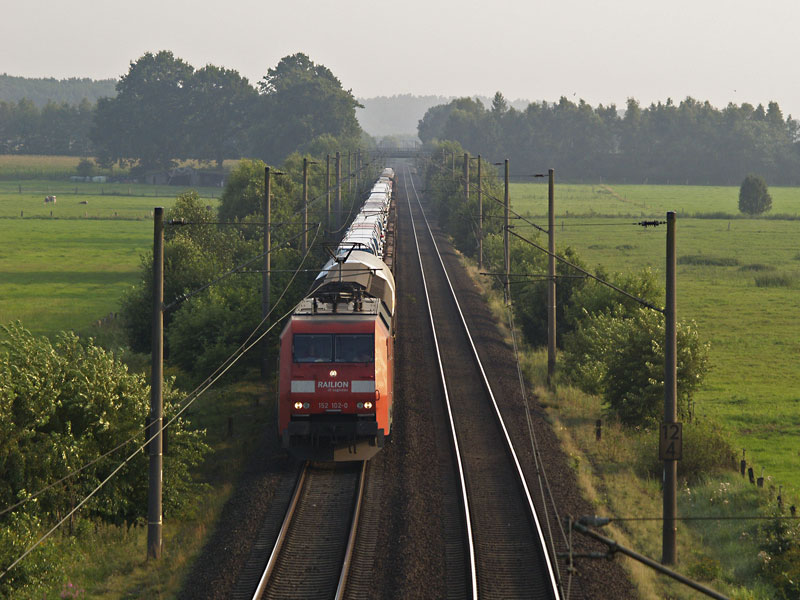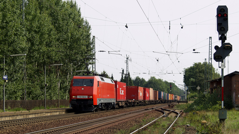 | Hier eilt die 152 124-4 mit dem "Verlegenheitsbalken" an der Front und ohne Eigentumsmerkmale wie DB-Logo oder so mit ihrem Containerzug gen Norden. Radbruch, 24. August 2006 | ||