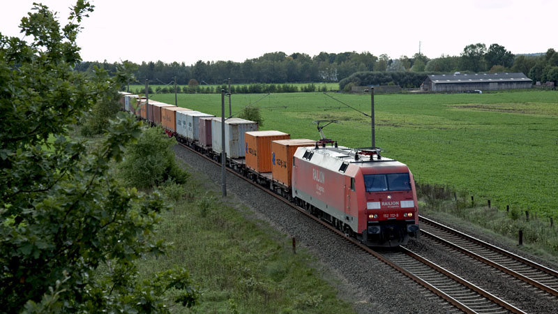 | Die 152 112-9 mit einem weiteren Containerzug nach Hamburg. Ramelsloh, 30. September 2010 |