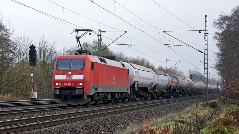 | Die 152 119-4 kam mit einem Kesselwagenzug von Itzehoe wieder zurück. Halstenbek, 16. November 2010 |
