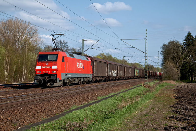 | Einen schweren gemischten Güterzug brachte die 152 105-3 nach Kiel-Meimersdorf. Halstenbek, 17. April 2011 |