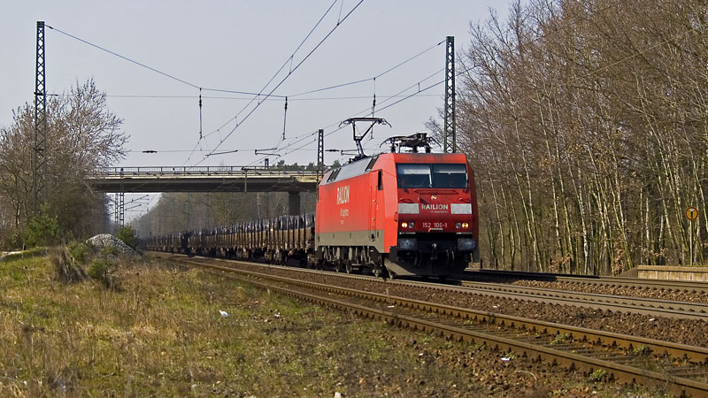 152 106-1 schleppte diesen langen Stahldrahtrollenzug auf dem Weg in Richtung