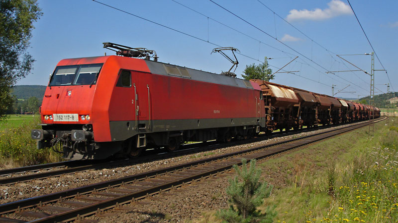 | Noch im alten Look von Railion wurde die 152 117-8 mit ihrem Getreideganzzug auf der Nord-Süd-Strecke im malerischen Haunetal angetroffen. 17. August 2005 | ||