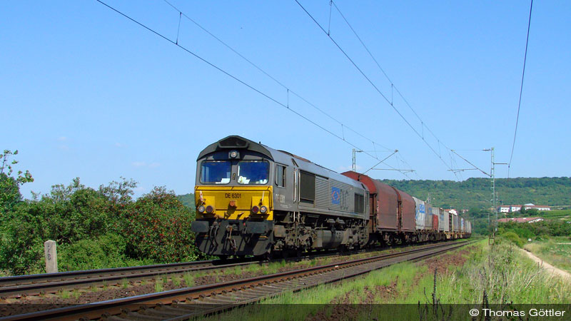 Class 66 DE 6301 ist hier bei Gau Algesheim mit einem schweren gemischten