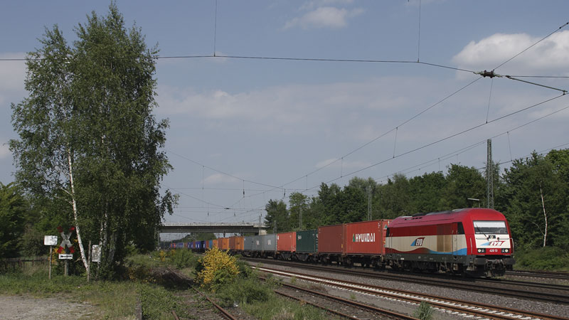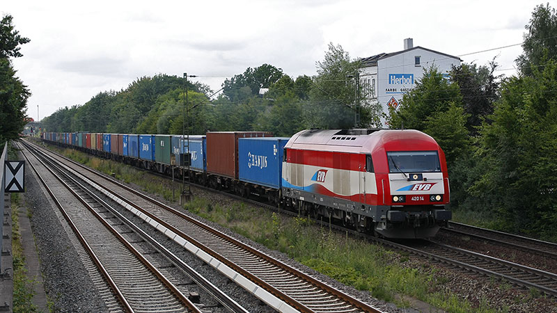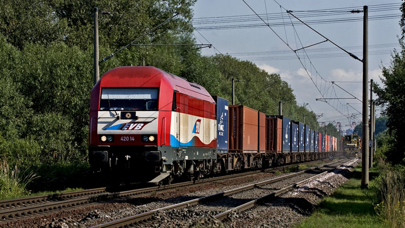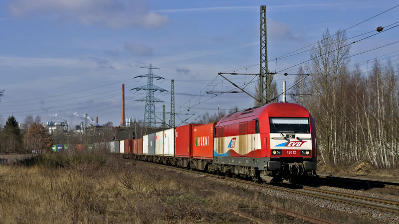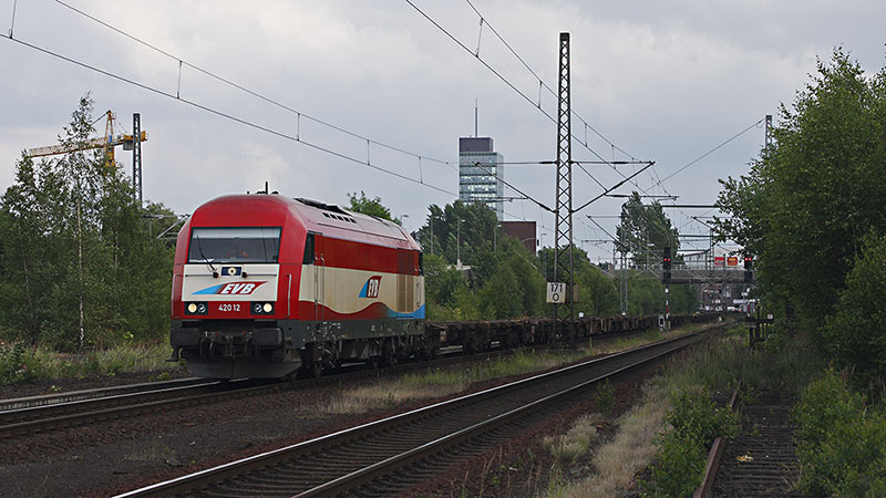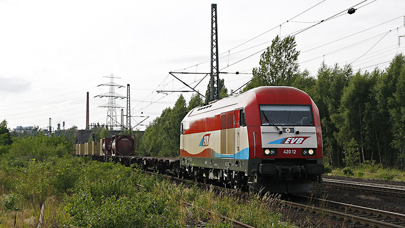 einem langen Containertragwagenzug am Haken fuhr die EVB 420 12 nach