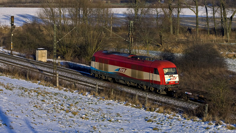 Dieser EVB Eurorunner Nr. 420 13 ist mit ihrem Zug nach Hamburg-Waltershof auf dem Moorburger Bahndamm unterwegs. 13. Januar 2007 | ||