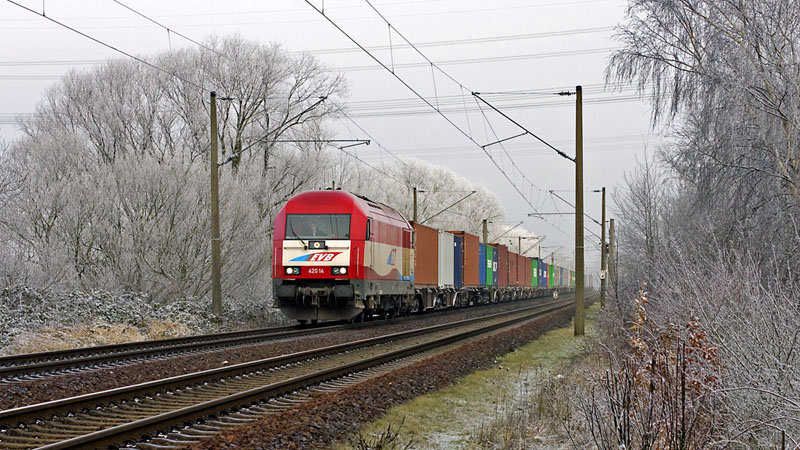 ein Hercules der EVB – die 420 14 mit herausfahrendem Containerzug. Hamburg-Moorburg, 28. Januar 2009 |