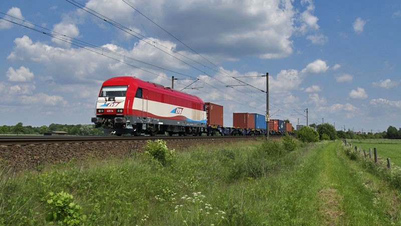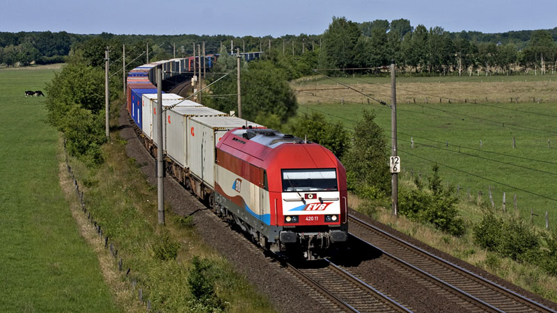 einem ellenlangen Leerwagenzug aus Containertragwagen rumpelt die EVB 420