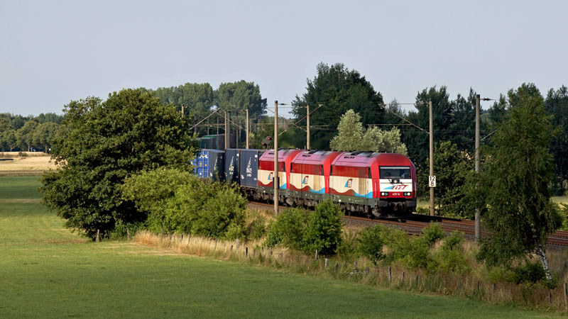 420 13 der EVB war mit ihrem Containerzug auf dem Weg nach Hamburg-Waltershof. Ramelsloh, 6. August 2009 |