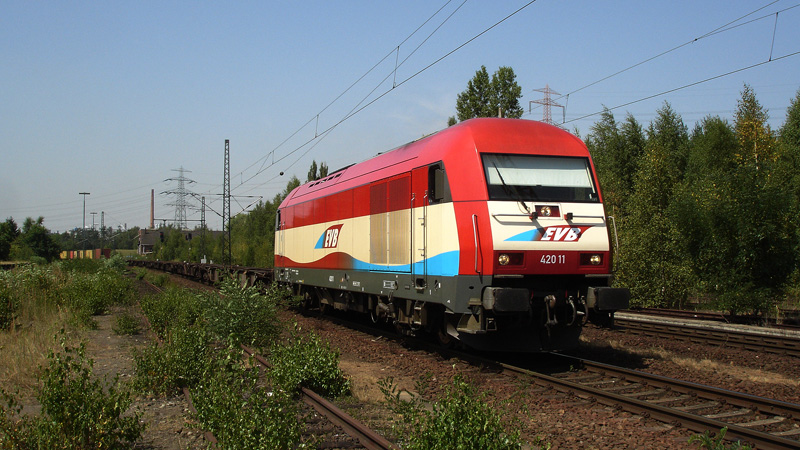 EuroRunner 420 14 der EVB hatte mit ihrem Containerzug Ausfahrt. Hamburg-Moorburg, 5. August 2009 |