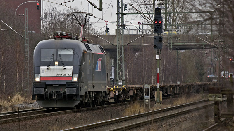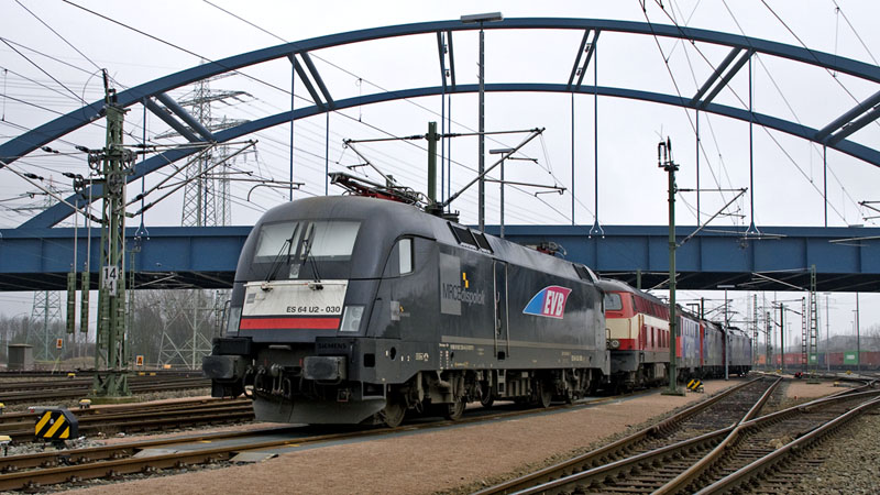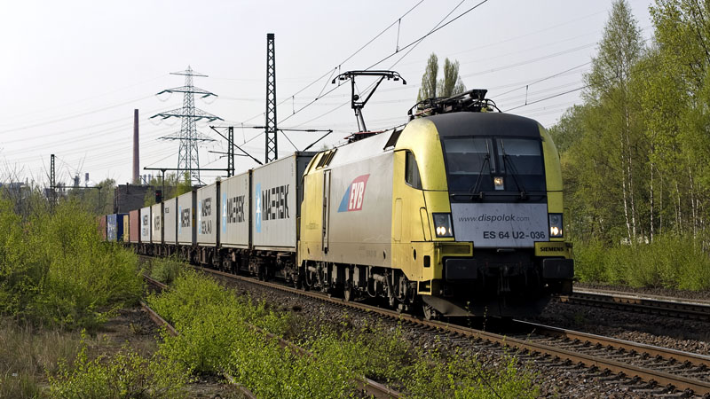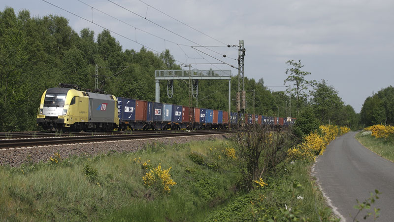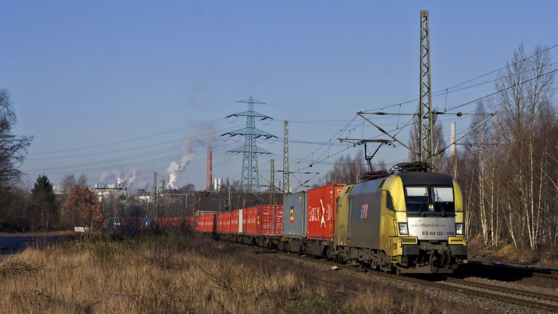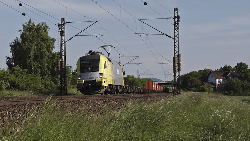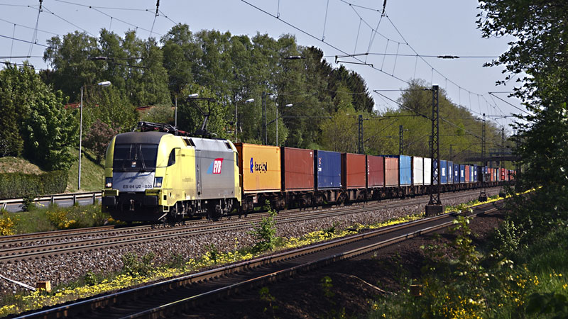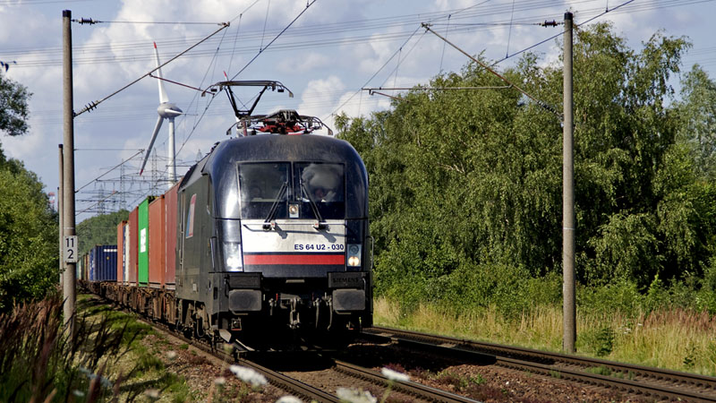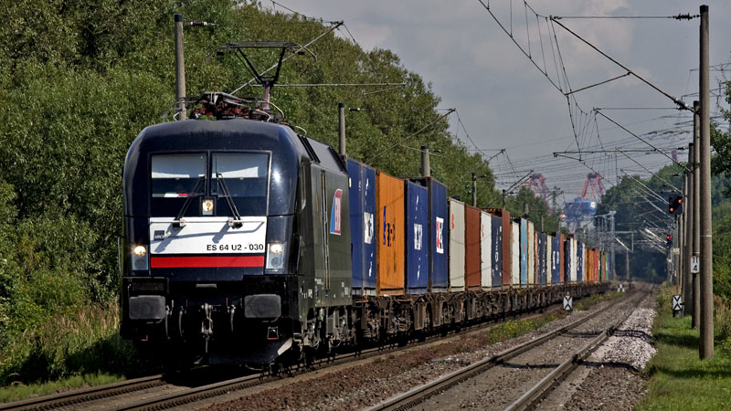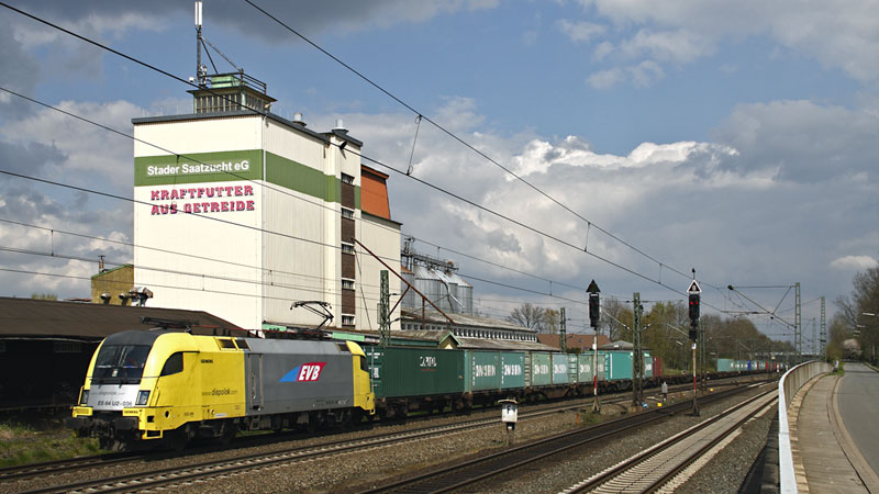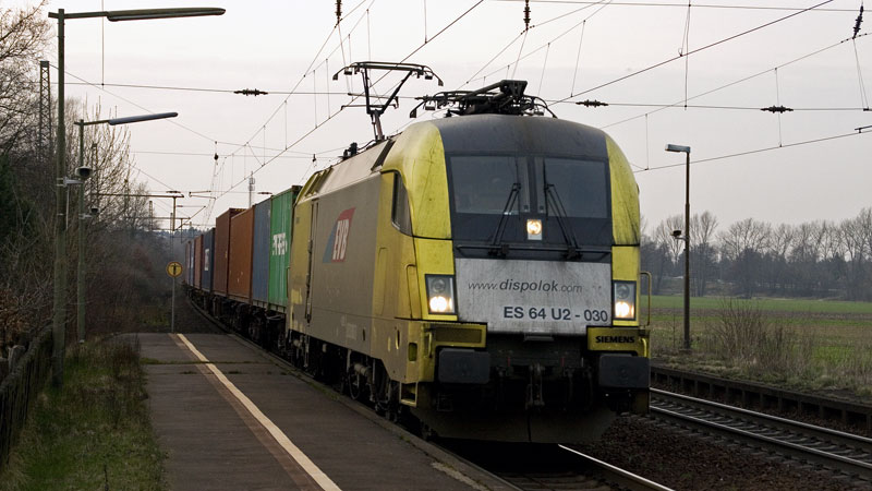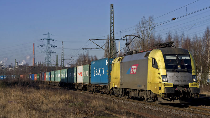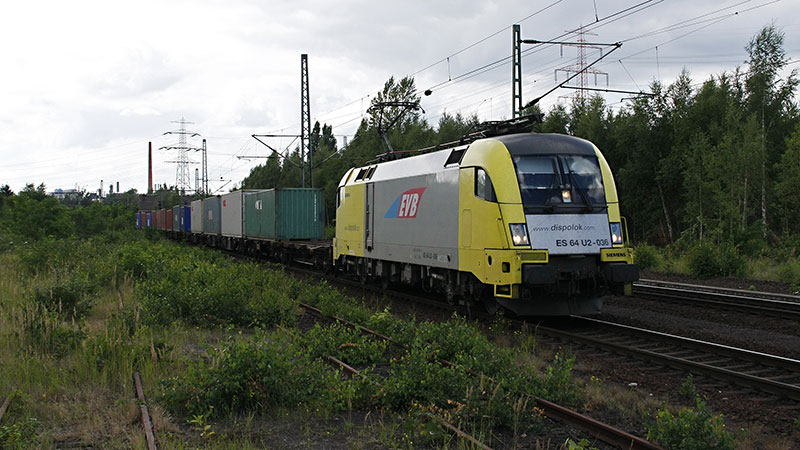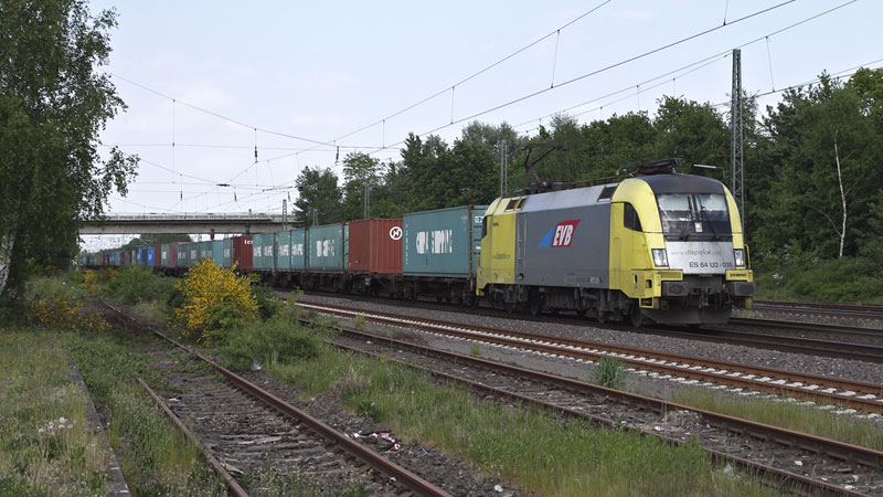 Dispolok ES 64 U2-030 in Diensten der EVB vor einem Containerzug gen