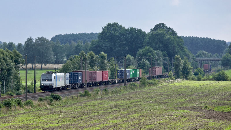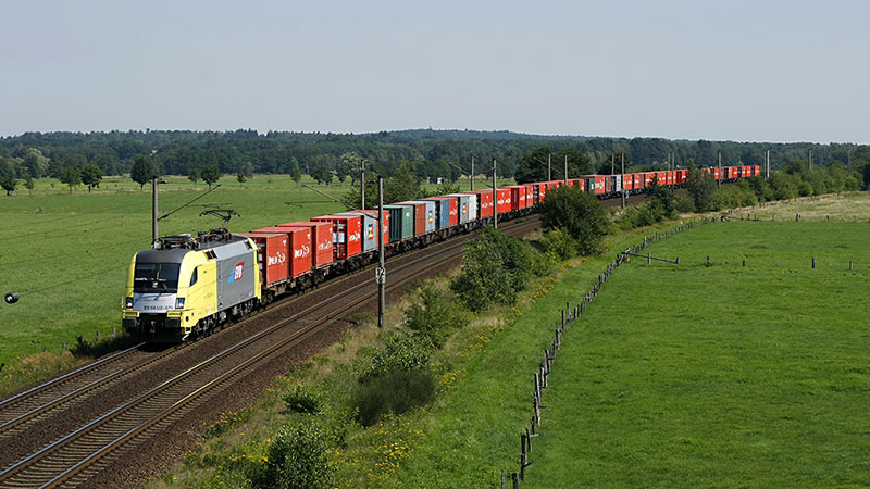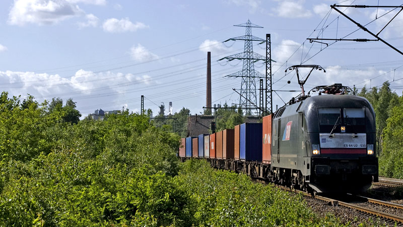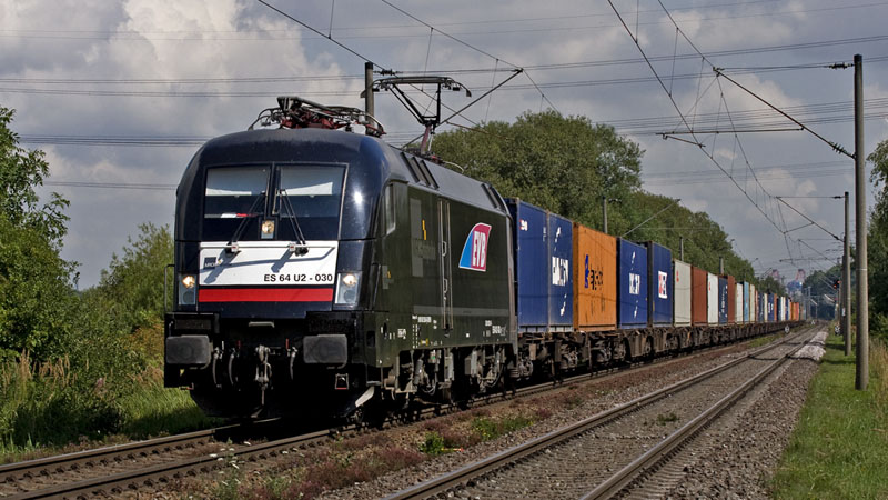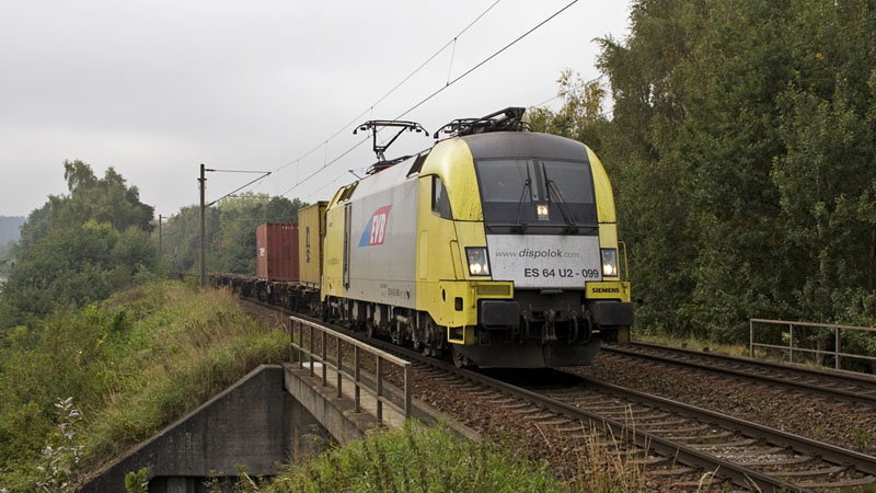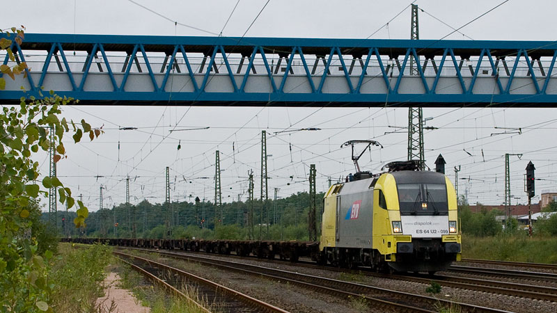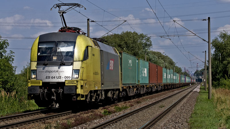 einem langen Containertragwagenzug polterte die ES 64 U2-099 der EVB
