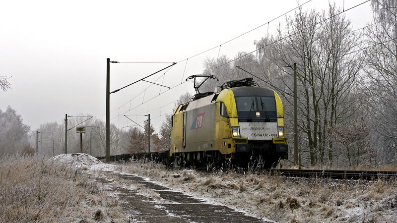 ES 64 U2-099 der EVB mit einem weiteren Containerzug zu den Bremer Häfen. Hamburg Unterelbe, 21. Januar 2009 |