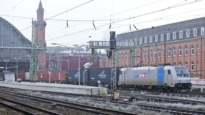 Die EVB 185 672-3 mußte unbedingt mit ihrem Containerzug ganz hinten fahren. Bremen Hauptbahnhof, 27. November 2010 |