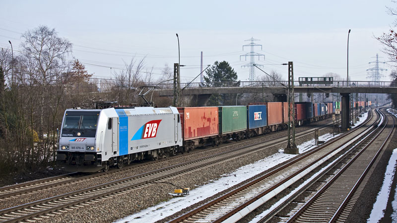 Die RailPool 185 676-4 der EVB mit einem Containerzug in den Hafen. Hamburg-Hausbruch, 24. Februar 2011 |