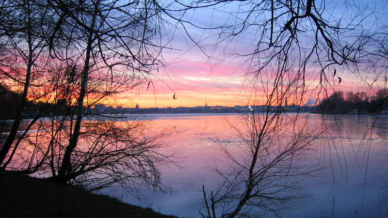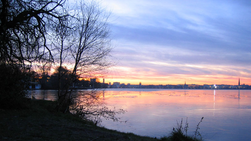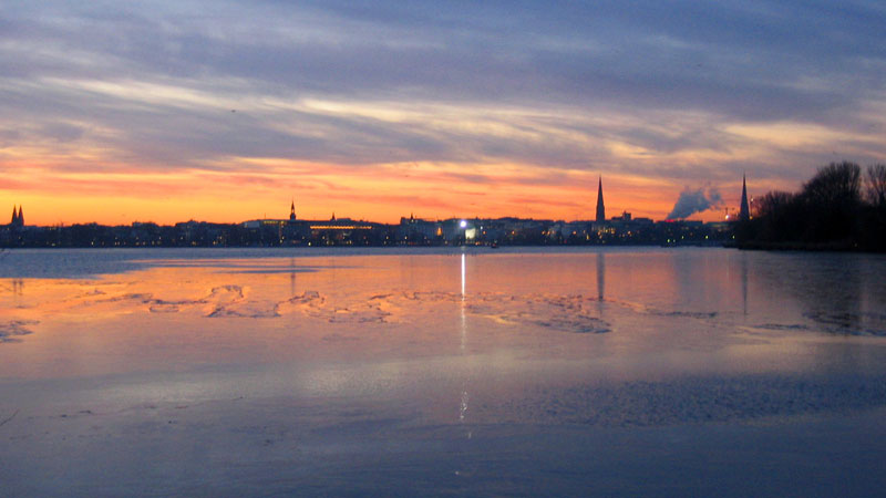 Hamburger Außenalster – die eine leichte Eisdecke trägt.