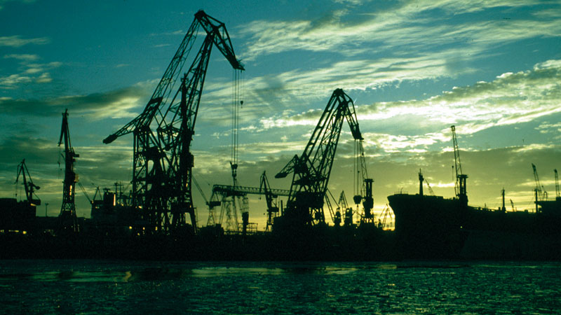 in dem ein Öltanker gerade repariert wird. In dem rechten Schwimmdock