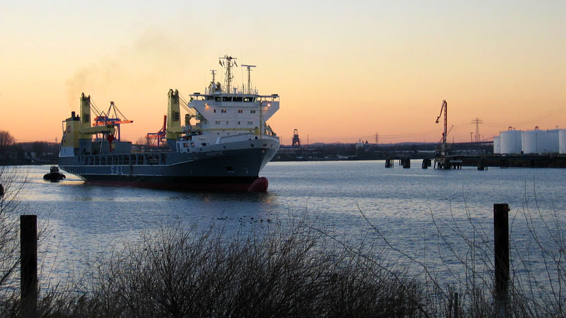angehobene Rethe-Hubbrücke (rechts außerhalb des Bildes) zu unterqueren.