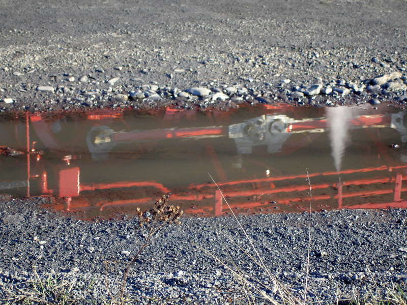 mit der 99 7240 und die Spiegelung ihrer Treibstange in einer Pfütze.
