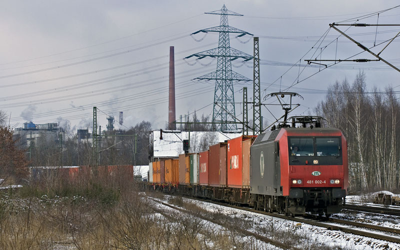 Containerzug hatte die schwarz-rote ITL 481 002-4 am Haken. Hamburg-Unterelbe, 14. Februar 2009 |