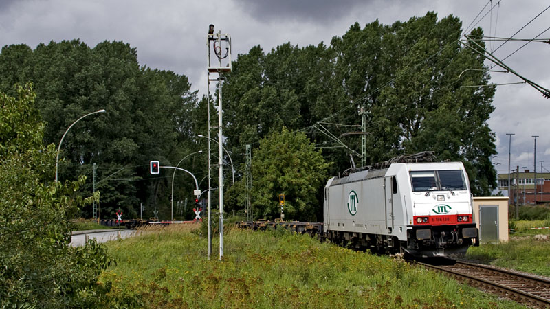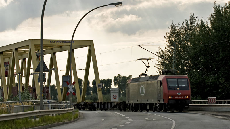 die 481 002-4 der ITL war aktiv und passierte soeben die Kattwykbrücke