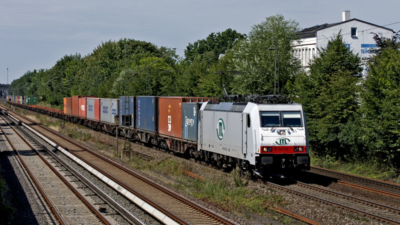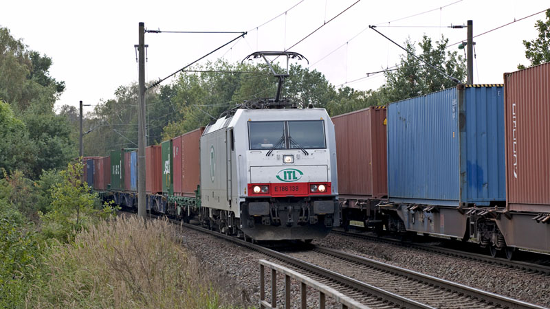 E 186 138 von ITL mit ihrem Containerzug von Waltershof. Hamburg-Hausbruch, 1. August 2009 |