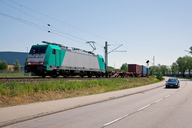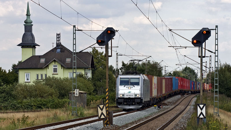 Ein Containerzug in die Tschechei mit der silbernen 185 562-6 der ITL. Hamburg-Moorburg, 4. Juni 2011 |