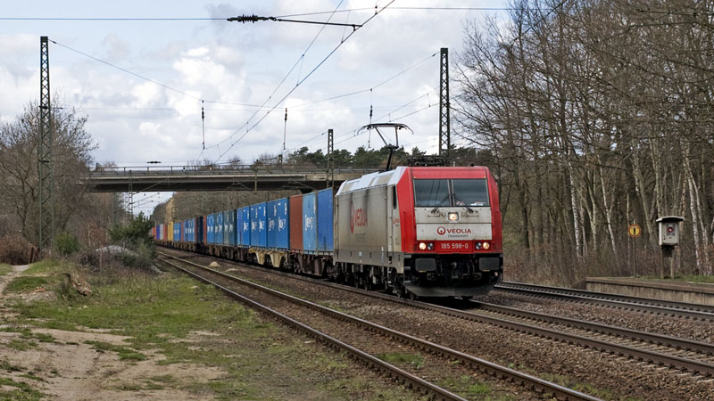 Die für ITL/Captrain fahrende 185 598-0 mit einem Containerzug von Hamburg. Radbruch, 9. April 2010 |