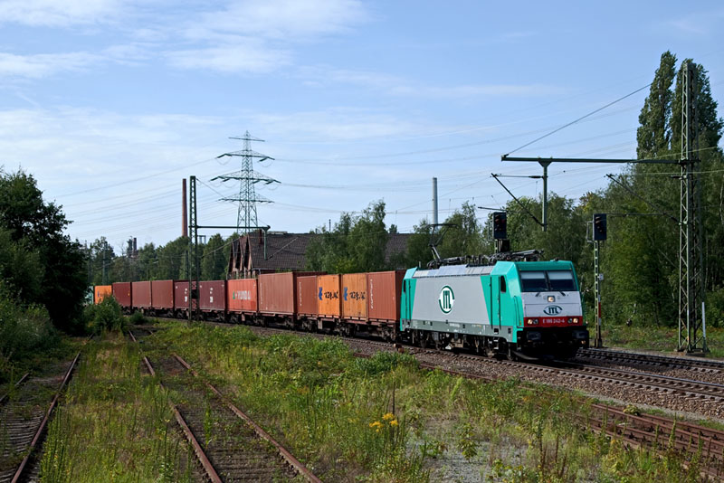 Die nun auch mit ITL-Logos versehende E 186 242-4 mit einem Containerzug aus dem Hafen. Hamburg-Unterelbe, 20. August 2011 |