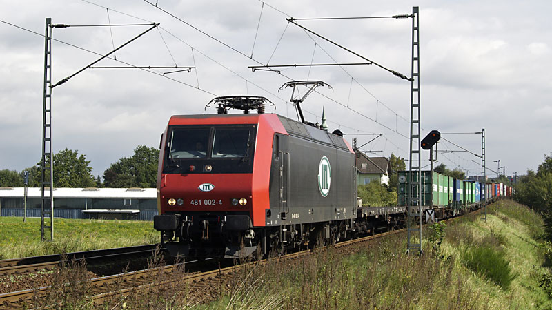 Im Blockabstand kam die ITL 481 002-4 mit einem Containertragwagenzug. Ramelsloh, 13. Juli 2010 |