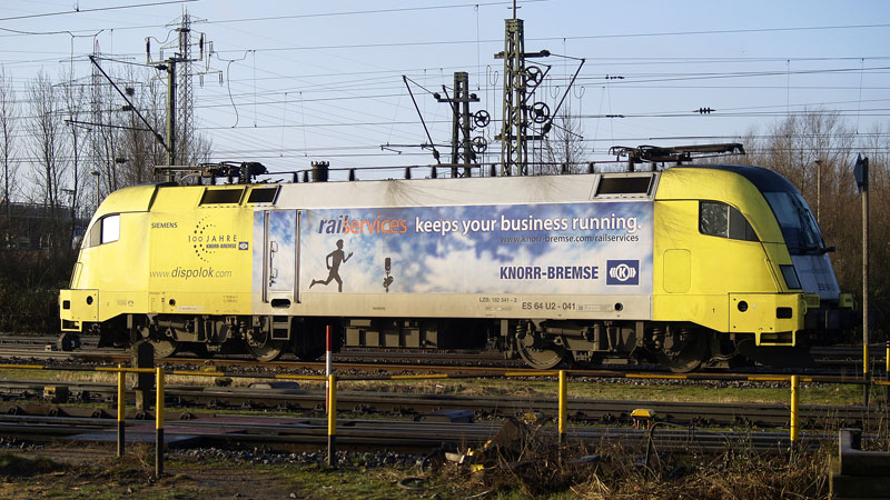 In Hamburg Waltershof, Bezirk Mühlenwerder, stand die ES 64 U2-041 der ITL mit der neuen "KNORR-BREMSE"-Werbung abgestellt. 10. März 2007 | ||