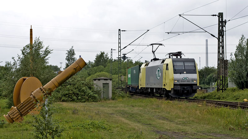 Ein ausfahrender Zug – und das gleich mit der ES 64 F-902 der ITL. Hamburg-Moorburg, 18. Juli 2009 |