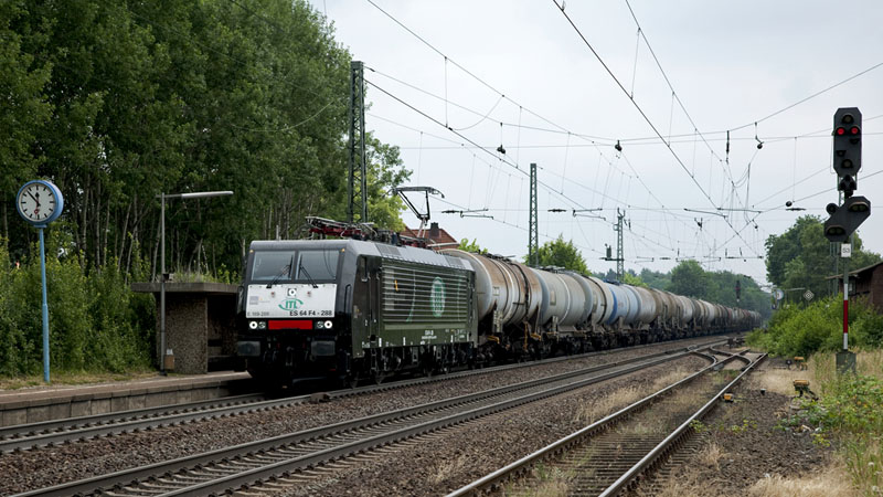 Mit neuer Beklebung an den Seitenwänden polterte die ES 64 F4-288 der ITL mit Kesselwagen gen Norden. Radbruch, 4. Juli 2010 |