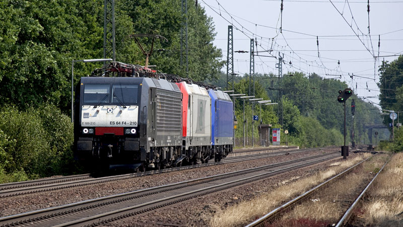 Drei total verschiedene Elloks für die ITL – Vorneweg die ES 64 F4-210 mit 185 650-9 und… Radbruch, 10. Juli 2010 |